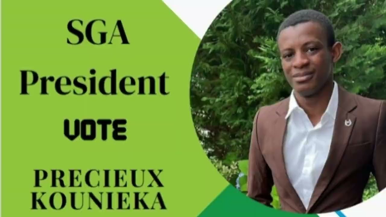 Precieux Kounieka is running for President, who serves as student liaison between college administration, faculty, and staff; serves as the student Board of Trustees member; and leads SGA General Body and Executive Board meetings.
